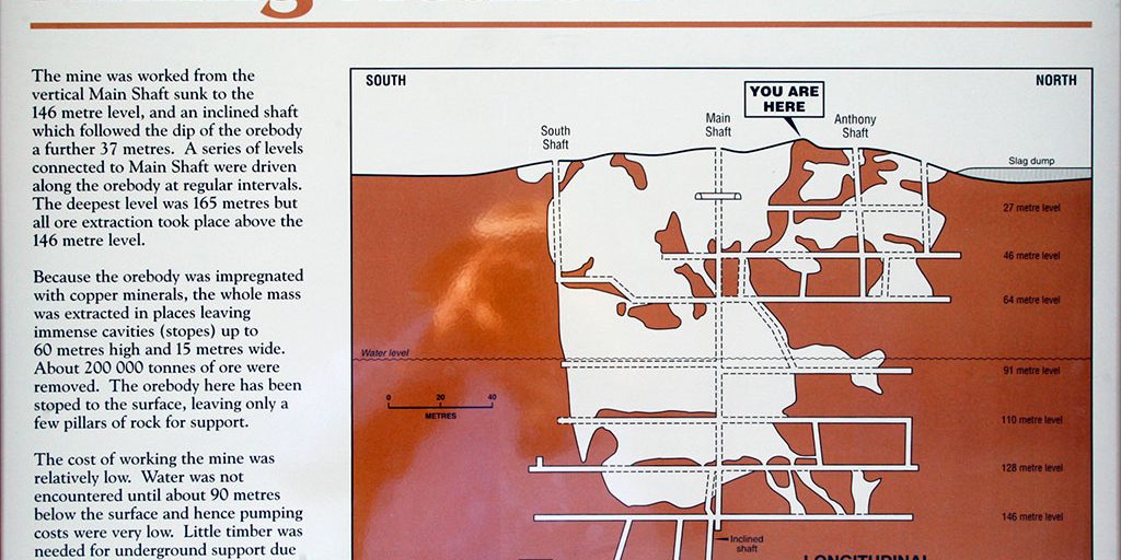 Copper mining occurred in the area from around 1862 through to 1907 when the ore ran out. In total around 10,000 tonnes of copper were removed from 200,000 tons of ore.